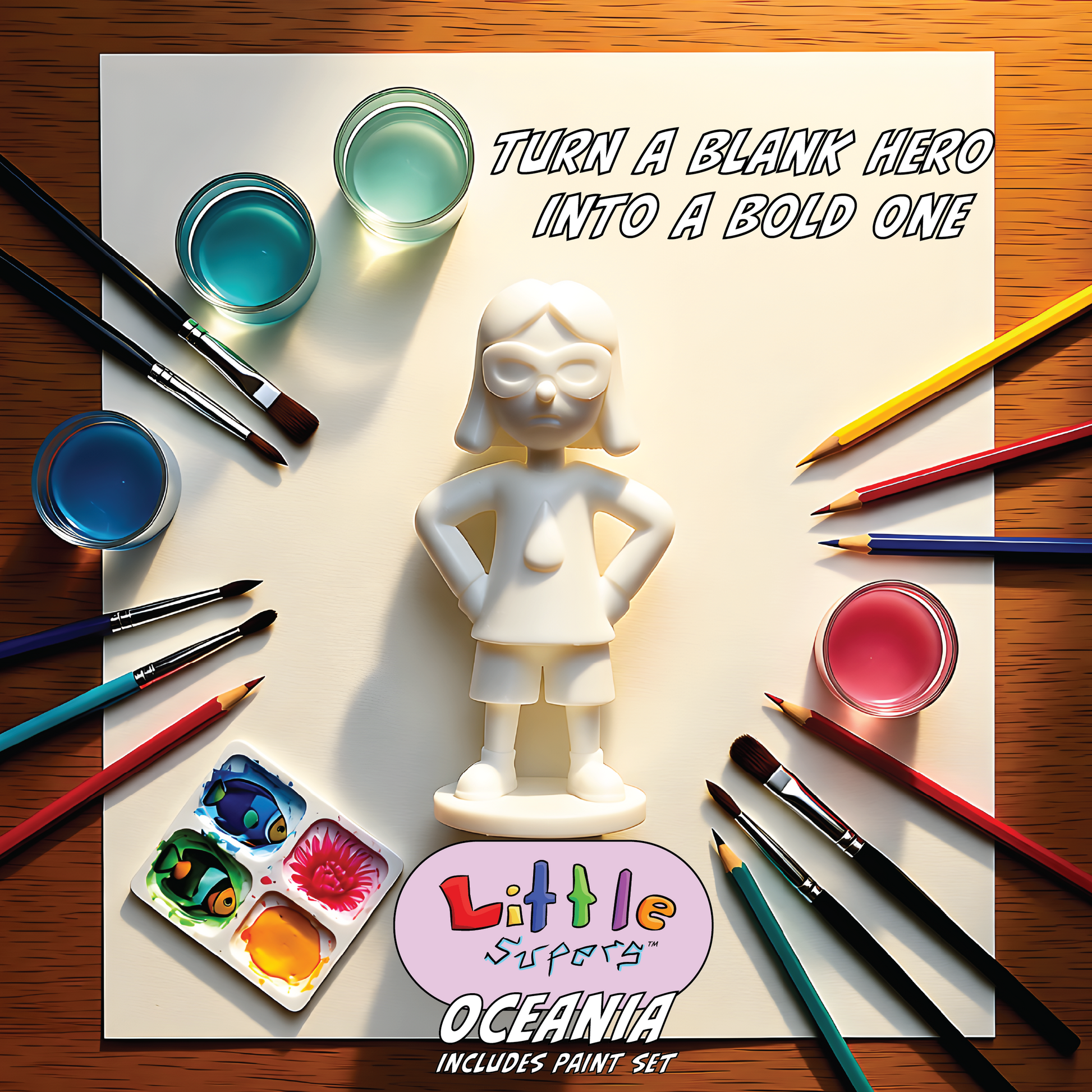 Make a splash with Oceania! Calm, confident, and powerful, she’s the heart of the team—and now she’s ready for your creative touch. Paint her your way and add her to your team of Little Supers!